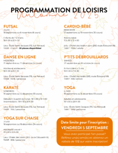 INSCRIPTIONS TERMINÉES | Programmation de loisirs automne 2025