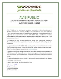 Avis public - Adoption du règlement de remplacement numéro URB-205-18-2025