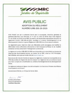 Avis public - Adoption du règlement numéro URB-205-20-2025