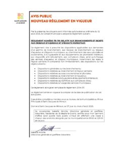 Avis public – Adoption règlement TR-701 relatif aux branchements et rejets aux réseaux d'aqueduc et d'égouts municipaux