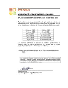 Avis public – Adoption du calendrier des séances du conseil municipal 2026